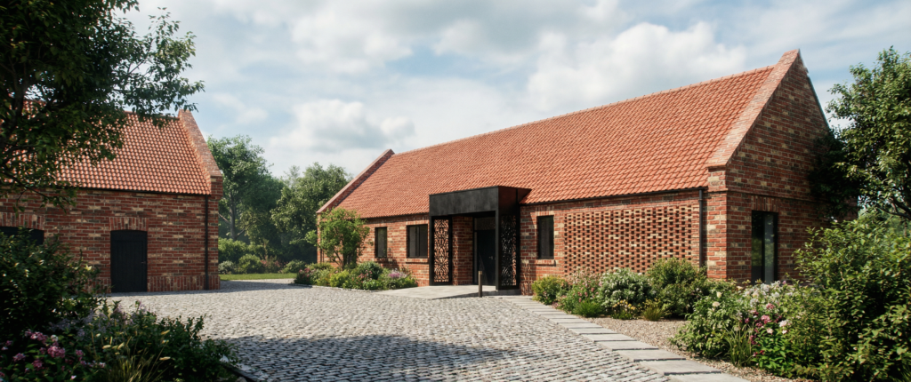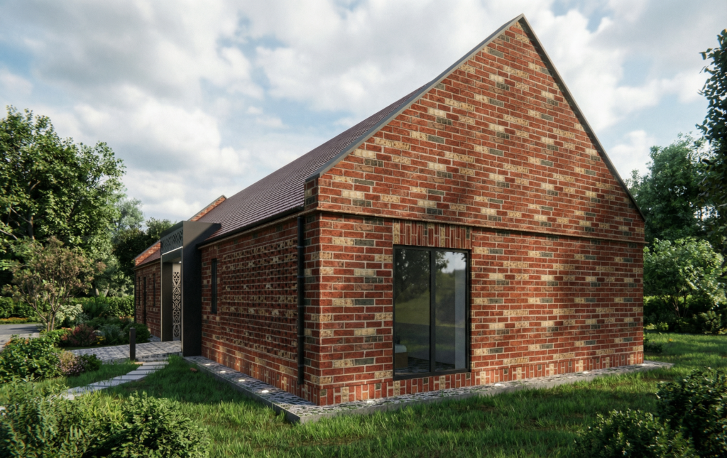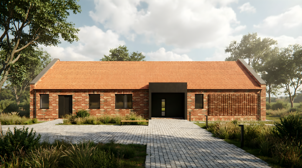 Projektowany dom powstał jako naturalne dopełnienie istniejącego budynku gospodarczego, którego elewacja została w całości zachowana, stając się ważnym elementem tożsamości miejsca. Nowa bryła nie konkuruje z zastaną zabudową, lecz harmonijnie się w nią wpisuje, czerpiąc z jej skali, rytmu i charakteru. To dialog pomiędzy tym, co było, a tym, co powstaje — subtelne połączenie tradycji z nową funkcją mieszkalną.